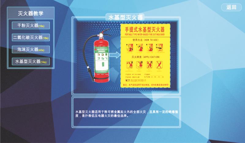 虚拟灭火体验实训系统采用公司自主研发的动作识别系统,3D 虚拟现实、无线通信等多种先进 技术手段。该系统分为消防教学、模拟演练、隐患排查三大部分。虚拟灭火体验实训系统配置 多种检测、评测模块,通过对灭火器状态的数据采集实现整个灭火流程的测评,达到自动检 测、自动判断、自动评分的效果。